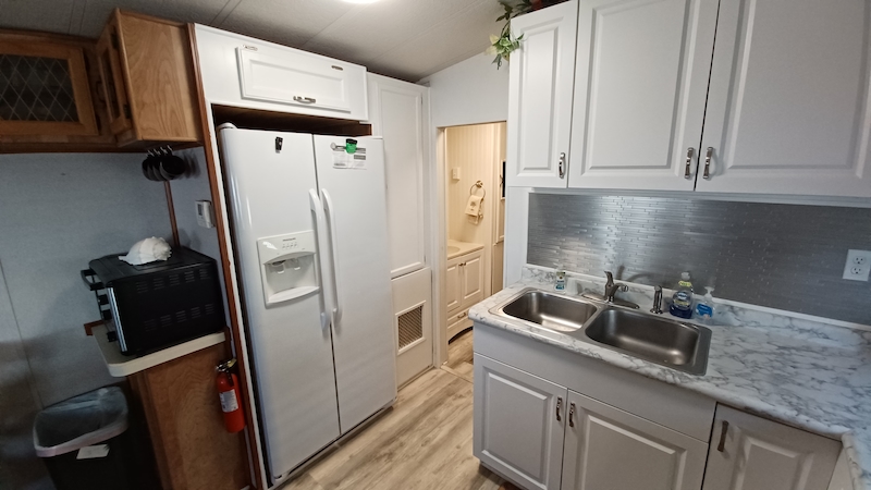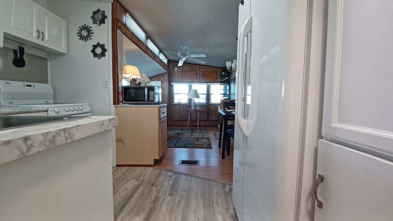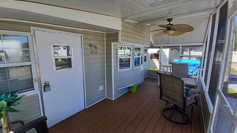 PRICE REDUCED!! Soak in the gorgeous Florida weather from your screened-in front porch, which leads into a charming sitting area and flows effortlessly into the living room, dining area, and kitchen. The updated kitchen boasts brand-new cabinets and countertops, while the renovated bathroom features a convenient shower insert with built-in seating. The generously sized bedroom fits a queen-size bed and includes ample storage with a full wall of closets and built-in drawers. There is a second room that can be used as a den, second bedroom or office area. A spacious utility room offers even more storage and comes equipped with a stackable washer and dryer. This home is a must-see located in Settler's Rest RV Resort, a 55+ active community — seller is VERY MOTIVATED! schedule your showing today!Features
