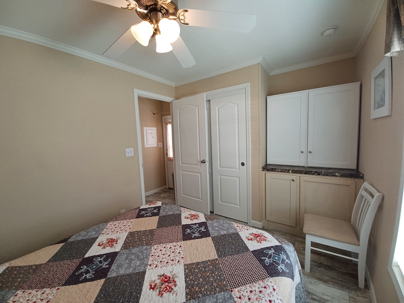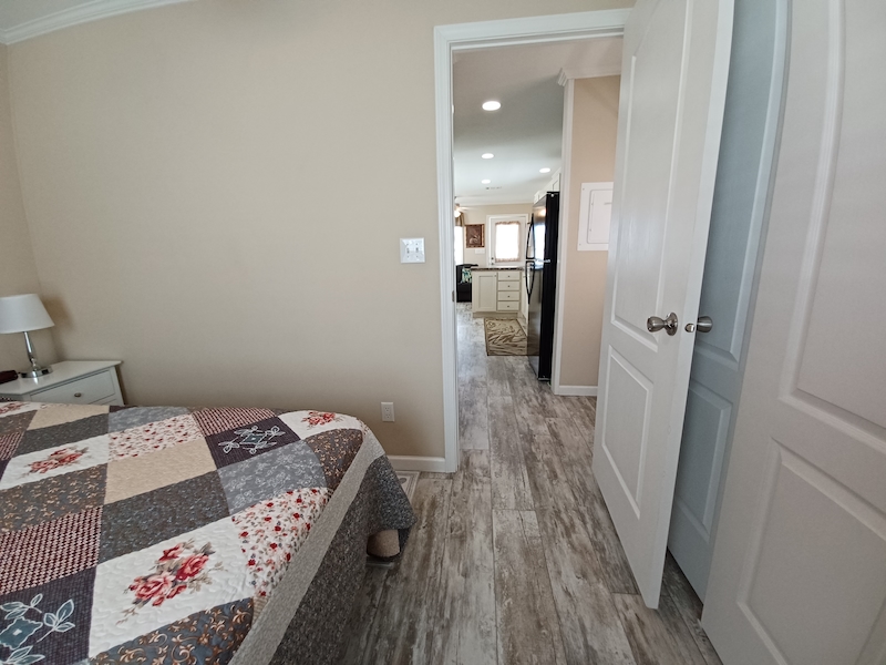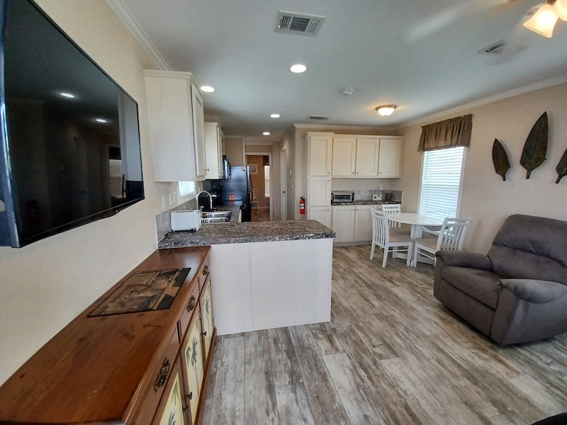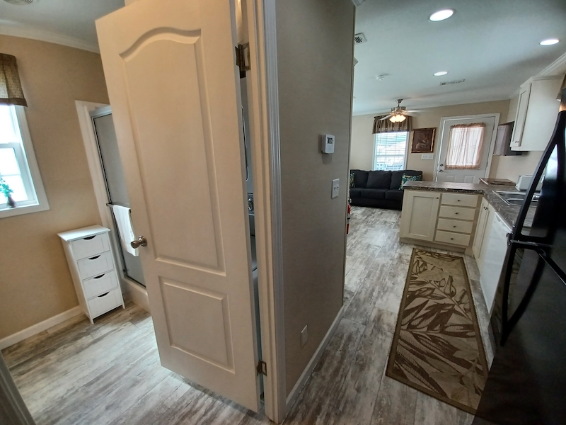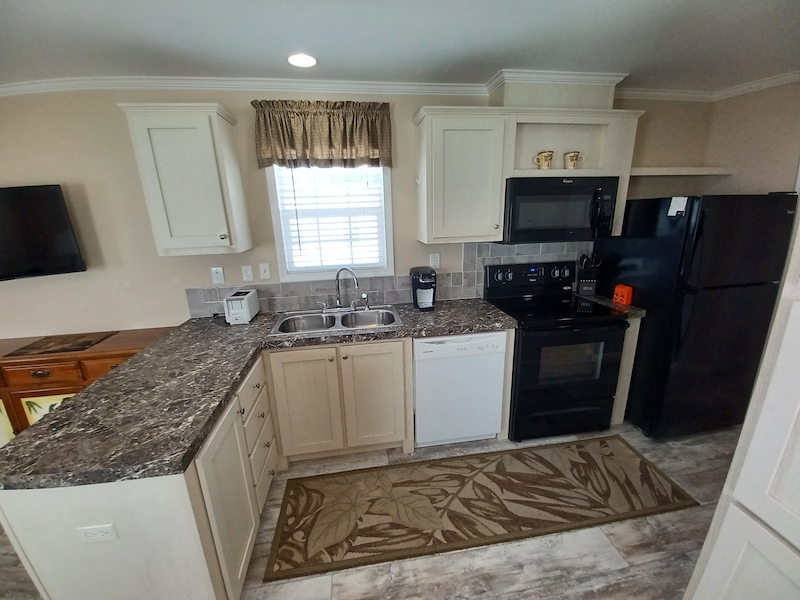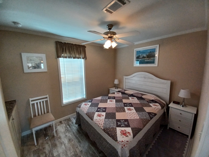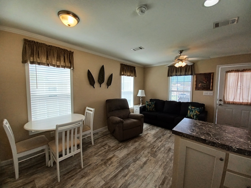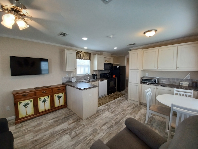 Kick back and enjoy the Florida breeze from your covered front porch in this charming 2017 one-bedroom, one-bath home. The extended driveway easily fits two cars, and the kitchen features sleek black appliances, including a dishwasher. Inside, a bright open layout connects the living, dining, and kitchen areas—perfect for laid-back living. The living room includes a queen sleeper sofa for guests, while central A/C keeps things cool year-round. The bedroom offers a queen bed, walk-in shower, and plenty of closet and storage space for easy, comfortable living.Features