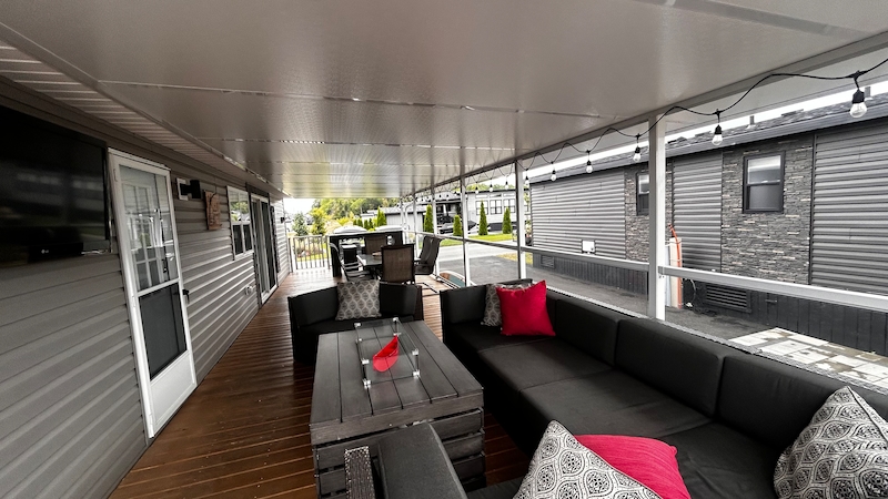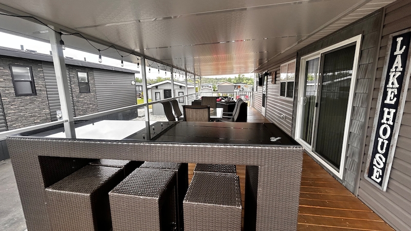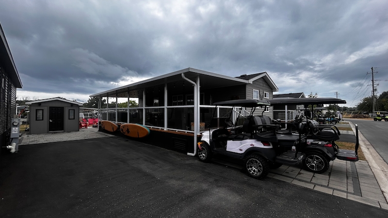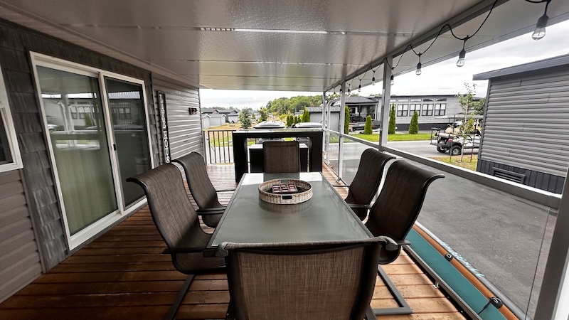 Step into comfort and style with QMD091. A 2021, 3 bedroom Onxy model featuring a fully covered deck with sleek glass and aluminum railings – perfect for outdoor entertaining rain or shine. This move in ready unit comes loaded with upgrades including a built in dishwasher, and an upgraded shed for extra storage. But that’s not all – your purchase includes a 2017 Club Car alpha, all patio furniture and even two paddle boards for endless summer fun. Contact the sales team today to schedule a viewing.Features