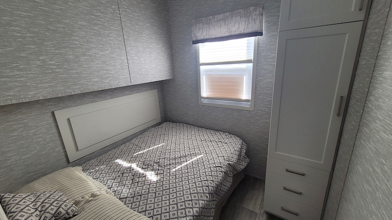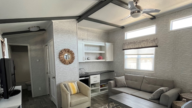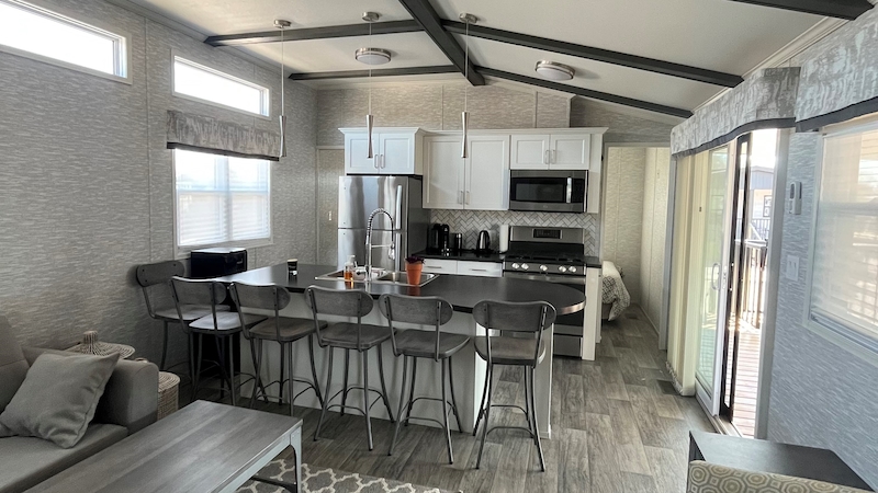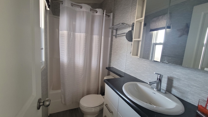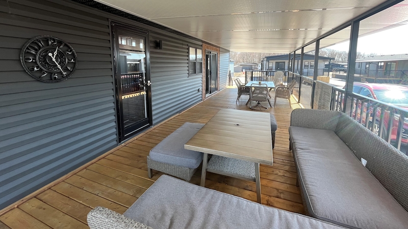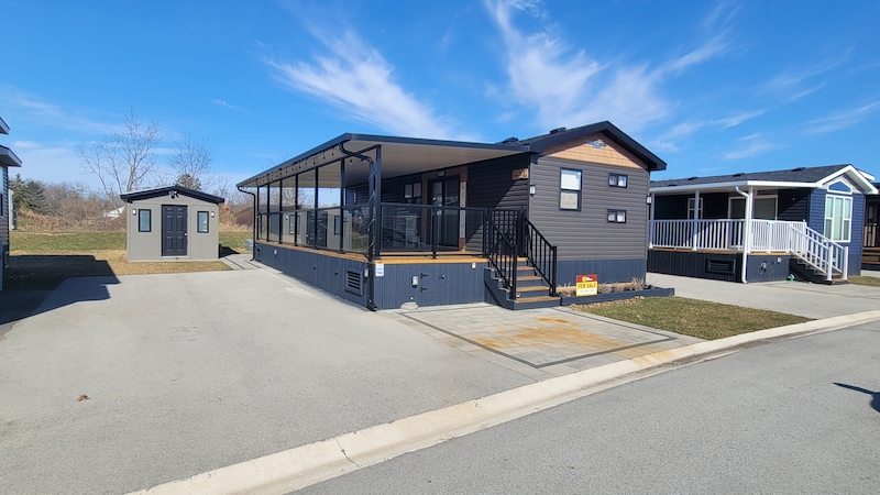 Located in the new section of Quarry Meadows this 2022 3 bedroom, 1 bath General Coach Onyx is move in ready! Finished with its sharp color combinations and black windows and doors the outside has a huge private driveway and fully covered deck. You can enjoy a nice fire in the backyard with no rear neighbors. Inside you'll have plenty of room for family and guests with its 3 bedrooms and sleeper sofa. The open concept floor plan uses all 14' of its width perfectly for esthetics and functionality! Contact the Sales Centre today to book your showing!Features