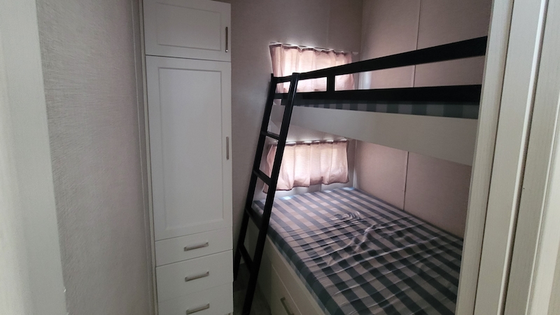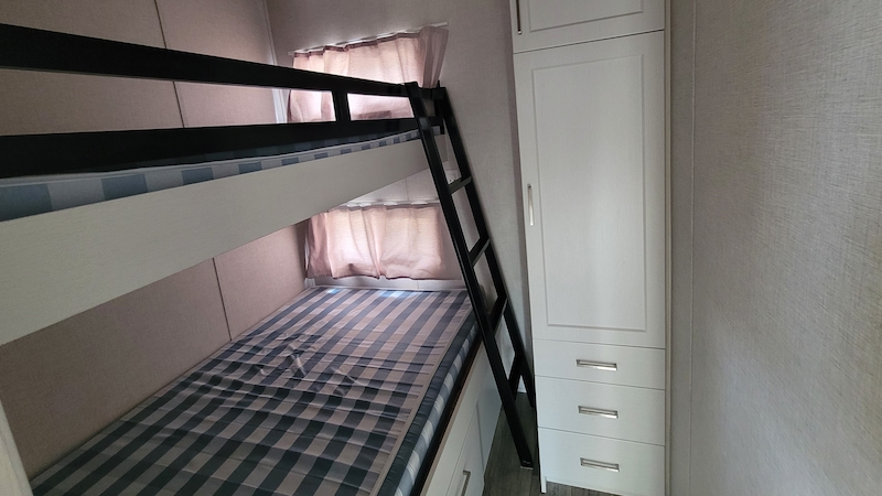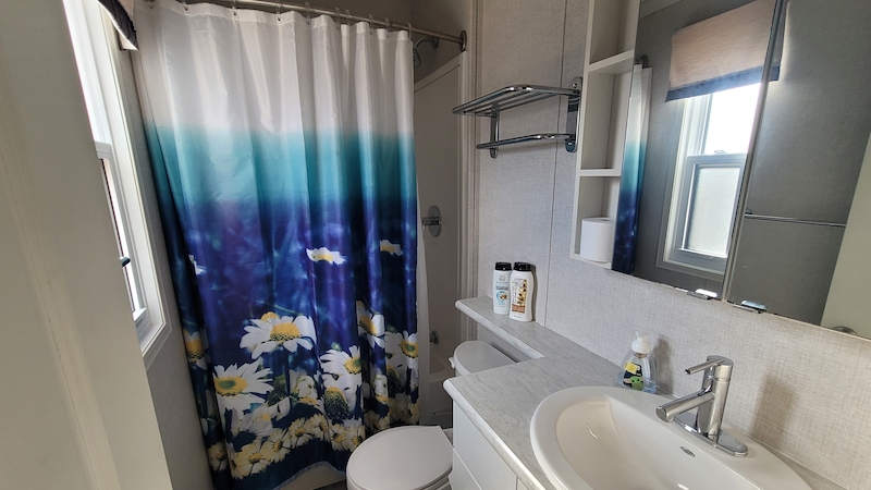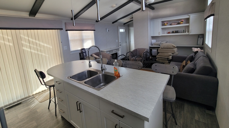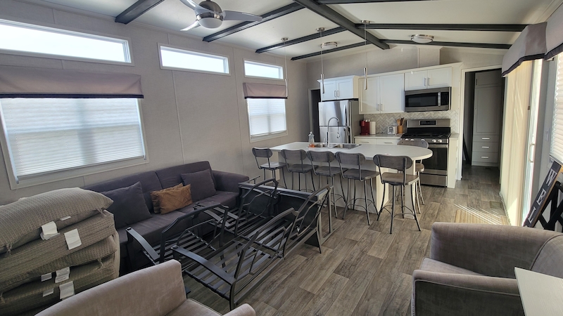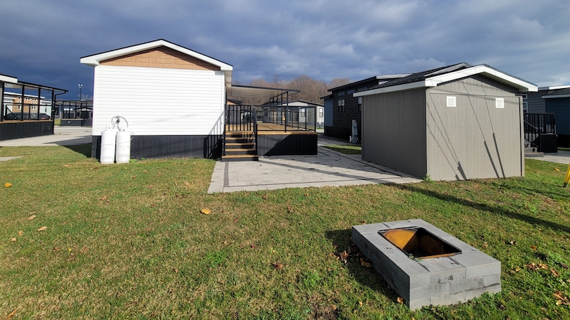 Located in our newly completed Quarry Meadows community, this 3 bedroom, 1 bath vacation cottage is move in ready! With 2 bedrooms of bunk beds and a pull out sofa in the living room you can sleep 8 people easily. The open, end to end floorplan is great for families with small children as the bedrooms are across the cottage from each other. Outside you’ll find half of the 40’ deck covered with a hard top awning and glass railings to finish it off nicely. The rear patio with fire pit is a great spot for family moments and of course, roasted hot dogs and S’mores! Contact the Sales Team to set up viewing.Features