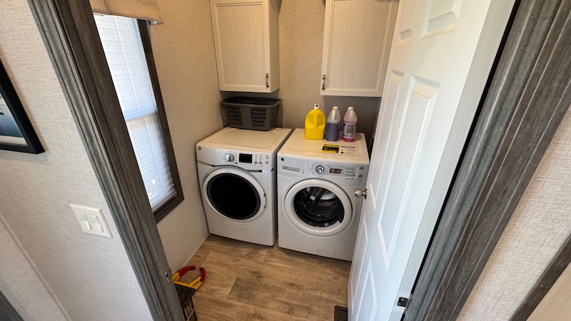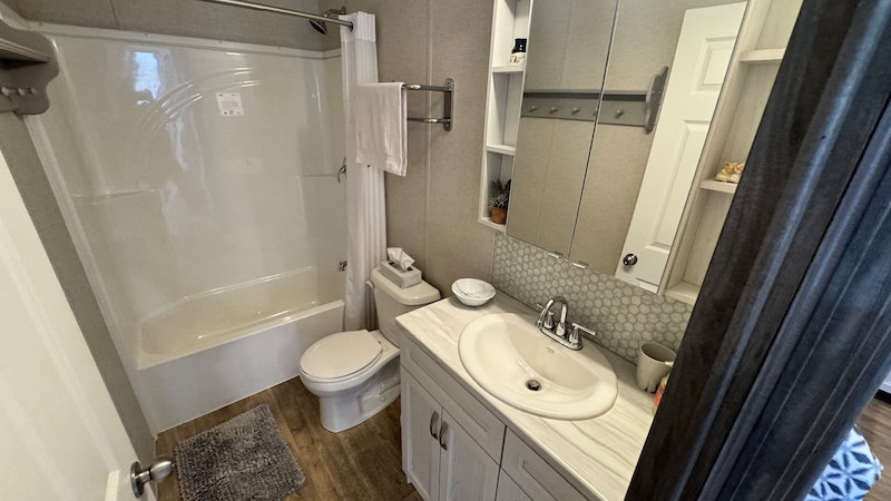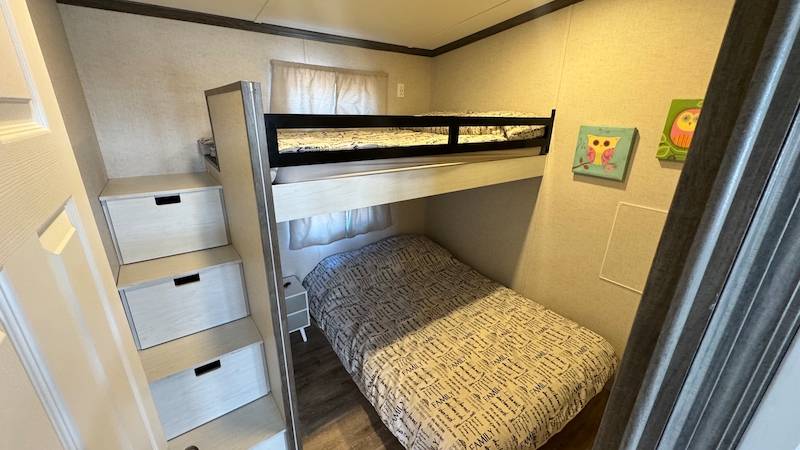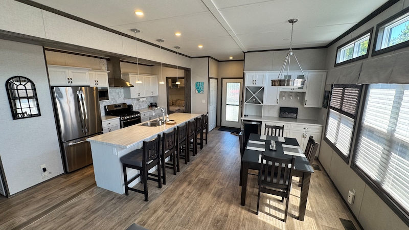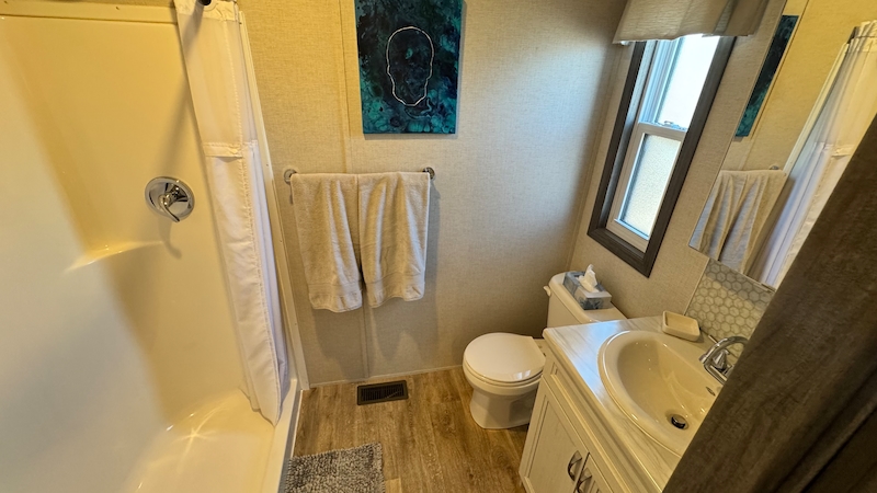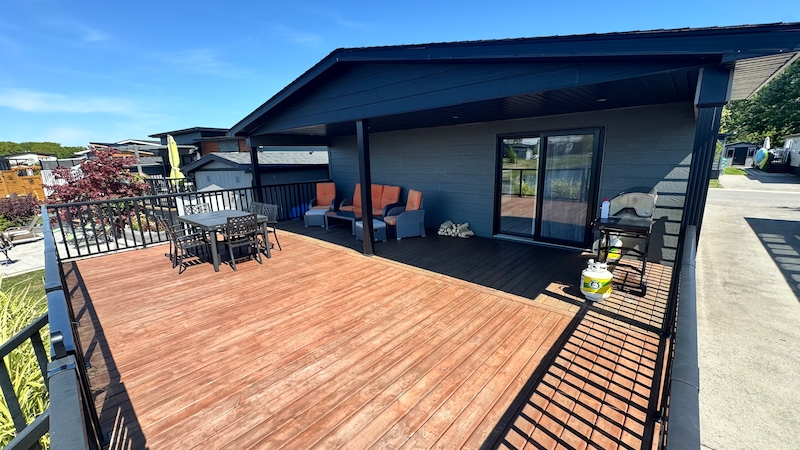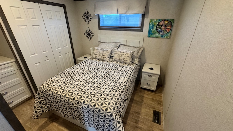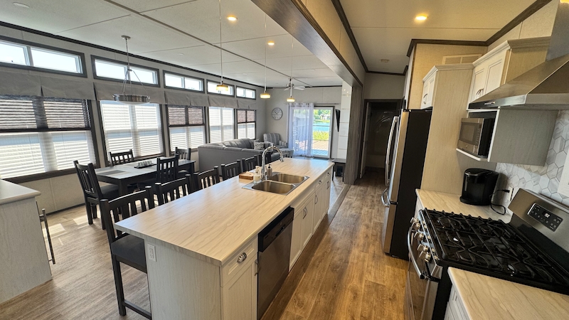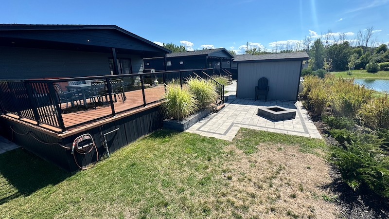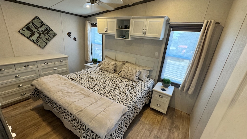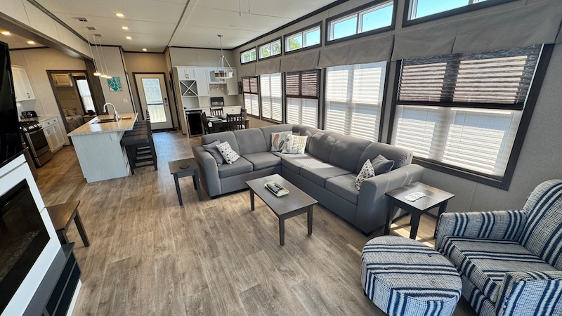 Located in the newly completed community of Quarry Meadows backing directly on to the pond is this gorgeous 3 bedroom, 2 full bathroom 994sqft double wide! With a full open concept livingroom, kitchen and dining room you'll enjoy entertaining family and friends with seating up to 12! The master suite boasts a king bed with his/her closets and a full ensuite. Round that off with a bunk bed room and a double bed room and a pull out couch in the livingroom and you can sleep 8 comfortably! Outside you'll enjoy plenty of parking, a full 100sqft shed with power and lights, a huge rear deck and patio area with firepit overlooking the pond. These sites are VERY coveted within the Resort - don't miss out on this one, book a tour today with a Sales Team member.Features