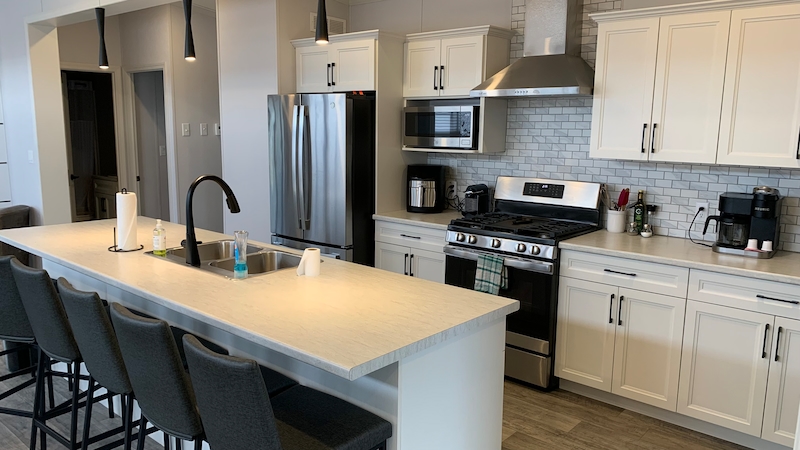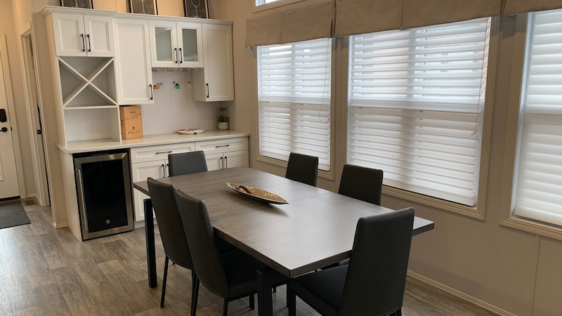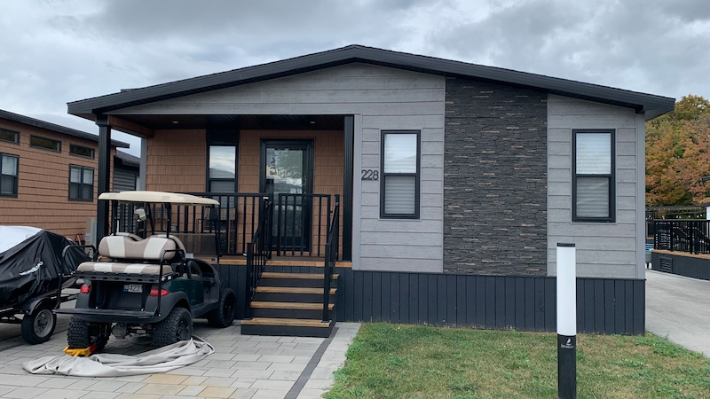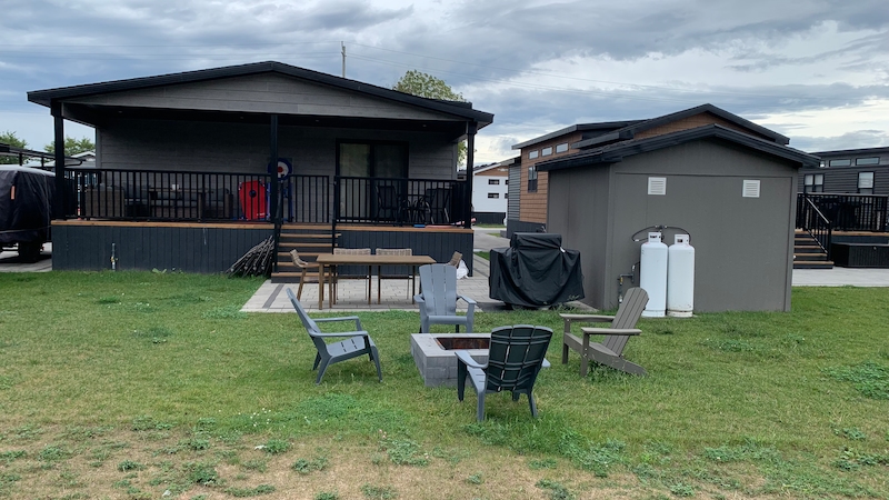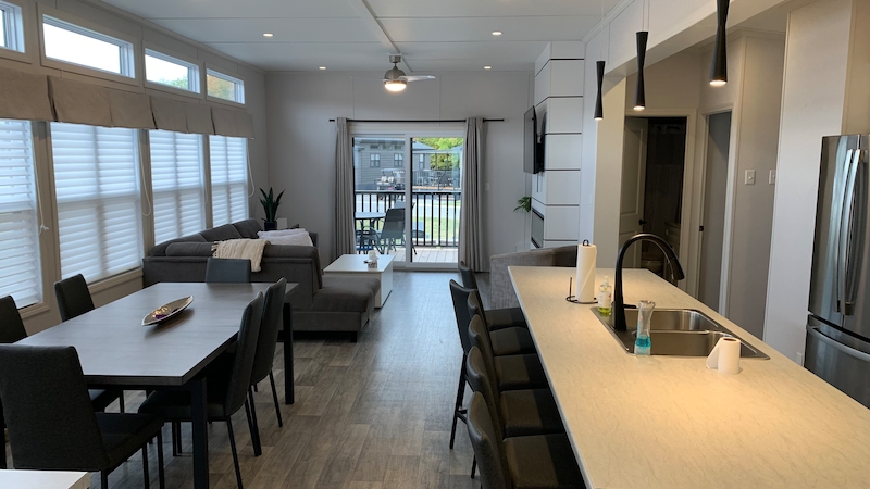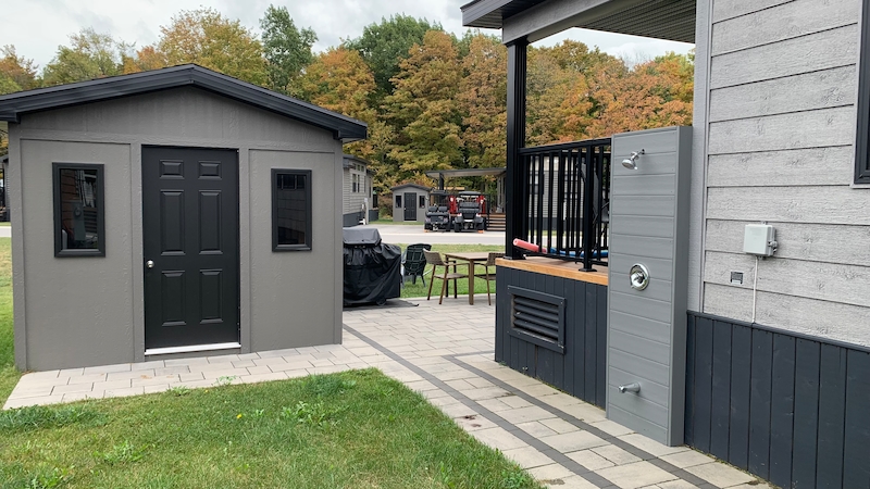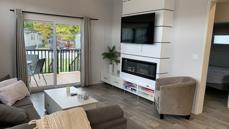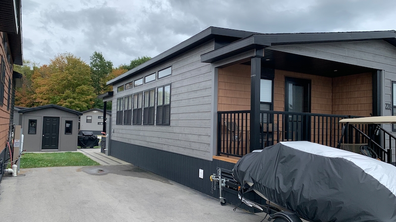 Quarry Meadows #228 is the popular and spacious Valley Rock model! Must see 3 bedroom, 2 bathroom cottage with open concept living, dining and kitchen area. Large kitchen island with seating and pendant lighting will be the hub for family gatherings. Built-in cabinets with beverage fridge in the dining make entertaining easy. Stunning fireplace with wall mount TV in the living room. Spacious primary bedroom with 2 closets and an ensuite bathroom. Second and third bedroom are perfect for kids and guests. Laundry room has front loader washer, dryer and additional cabinetry. Covered deck in the back overlook the patio, firepit and open space. Also features a 10x10 shed and outdoor shower! This cottage is MOVE-IN ready! Contact the Sherkston sales team today!Features