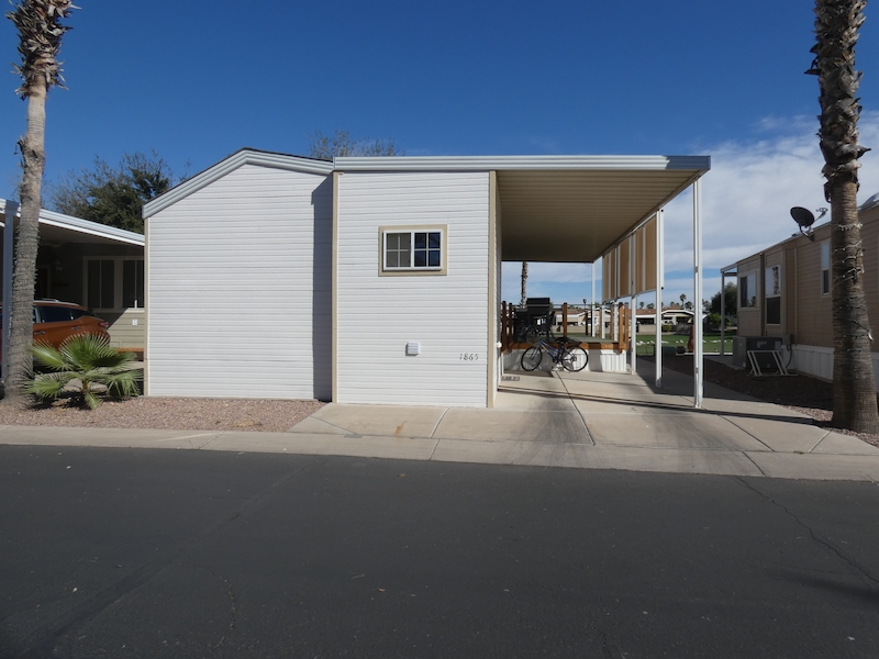 Located at 1865 Oasis Drive, this 1-bed/1-bath park model is a must see. Ideally located on the 18th green, this home boasts of a large deck, spacious back area and a gorgeous view! The large shed has a full size washer and dryer and plenty of storage room. Inside you will find a u-shaped kitchen with upgraded counter tops, a walk-in shower and the living room facing the golf course. Imagine, sitting on your deck watching the beautiful Arizona sunrises, or to entertain guests. Off the deck, the area is ready for you to add your personal touch by adding patio, for additional entertaining space. Did you know after purchasing your home you can sub lease it? That’s right, your home can work for you! Don't wait to view this great home contact the sales office today to schedule your private viewing.Features