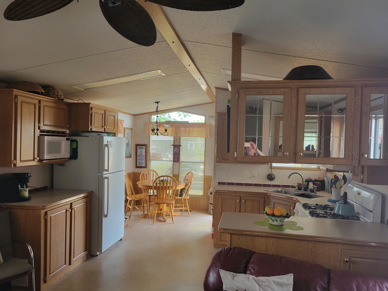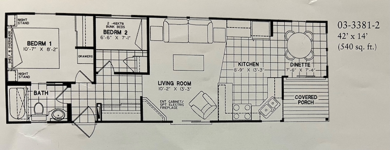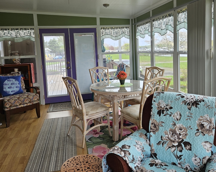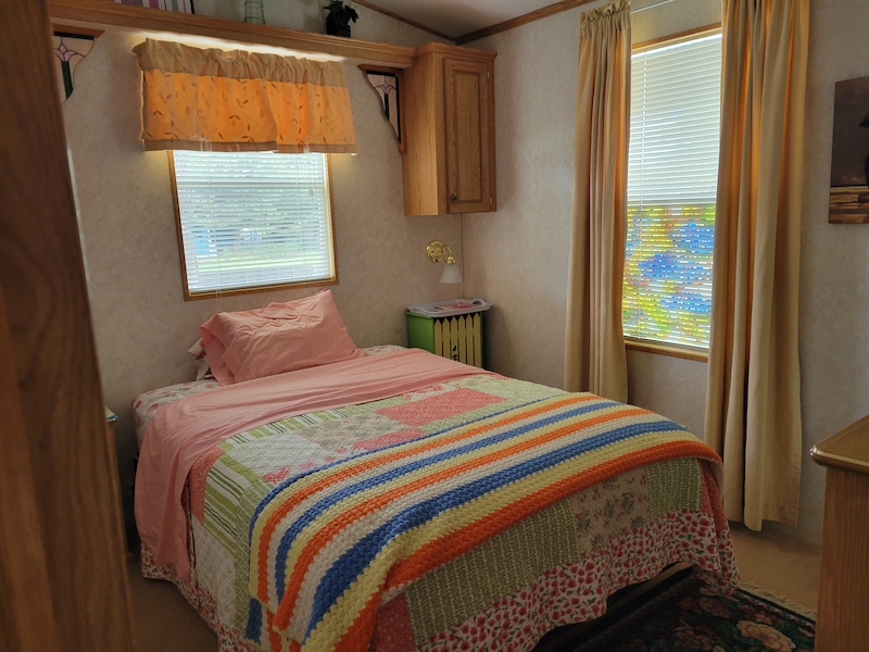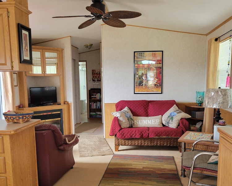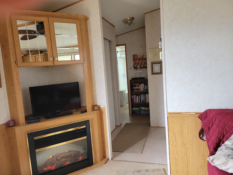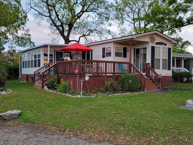 This is your opportunity to own a stunning Waterview vacation home with the lowest park seasonal fees! QVV002 sits on a unique lot offering lots of privacy, parking, and great outdoor entertainment space on the 12x20 deck and large front and back yards. This home is 14' wide and features an electric fireplace and built-in TV stand. The 12x20 sunroom (adds 240 sq feet to your home!) overlooking the quarry is surrounded by large windows and easy care laminate flooring. Upgrades include: roof (2018), electric hot water heater, sinks/faucets, skylight, and new deck. Contact our sales team to see this move-in gem on the quarry front.Features