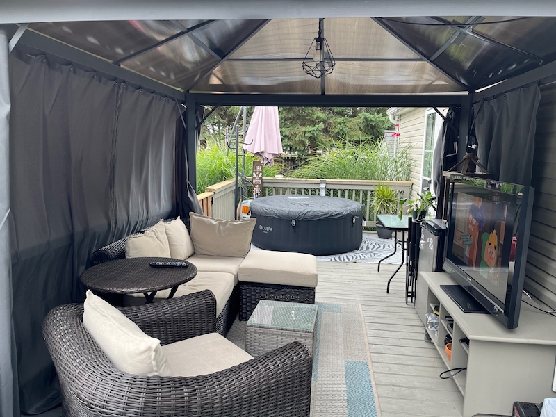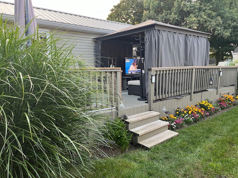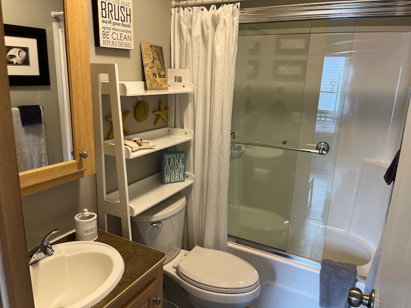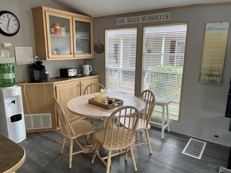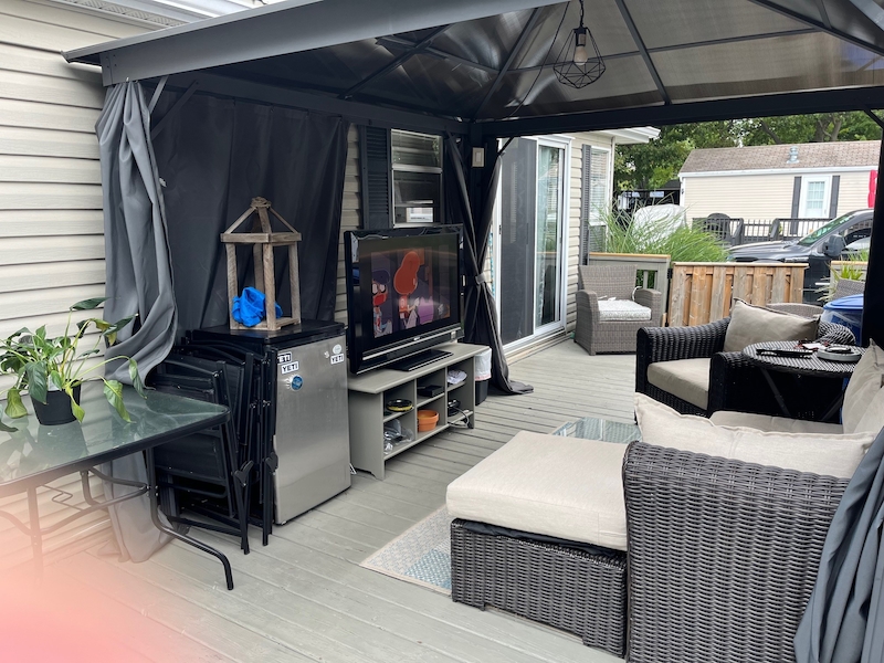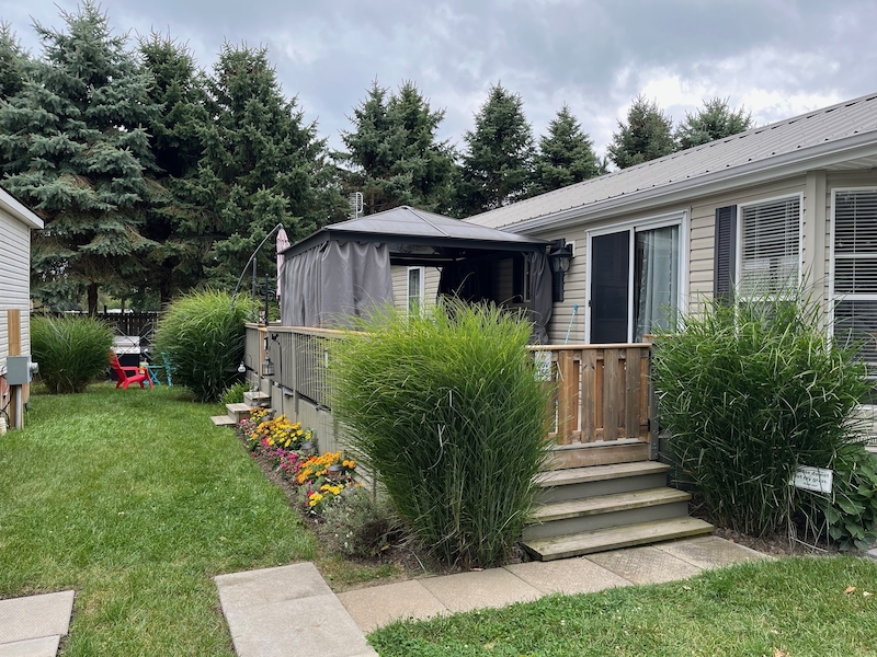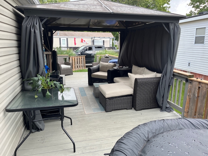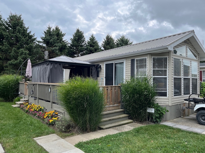 Welcome to Evergreen #56! Located close to resort amenities, this cottage has no rear neighbours and a private rear yard. The deck has a hard roofed gazebo, creating a cozy living space outdoors. Open and spacious living room, dining room, and kitchen area. Plenty of room for the family with 2 bedrooms and 1 bathroom. Recent updates include metal roof, shower enclosure, new mattresses, light fixtures, and painted throughout. Contact the Sherkston sales team to book your appointment today!Features