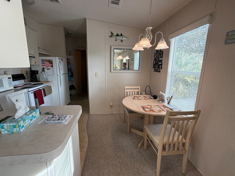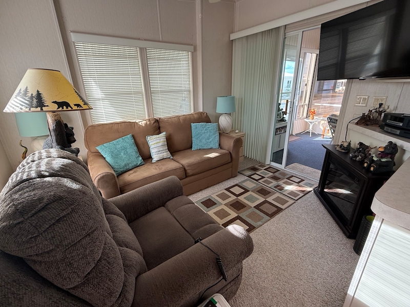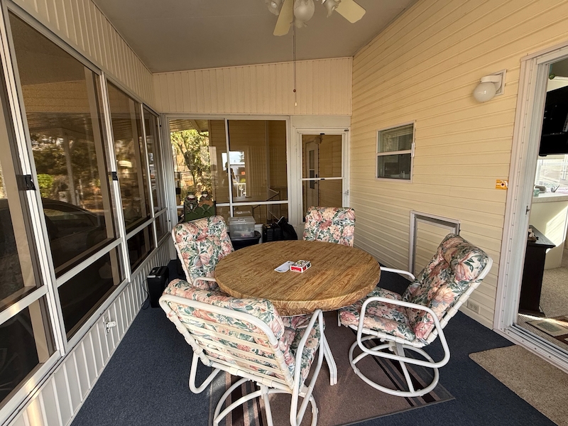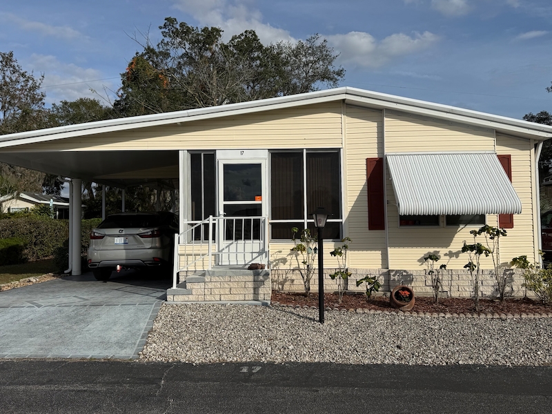 Charming 1 bed, 1 bath park model with a spacious Florida room and carport. Tastefully furnished and move-in ready, this home includes a golf cart for easy community living. Features include carpet, new A/C (2025), updated plumbing, lifetime rubber roof, and new windows in 2024.Incentives