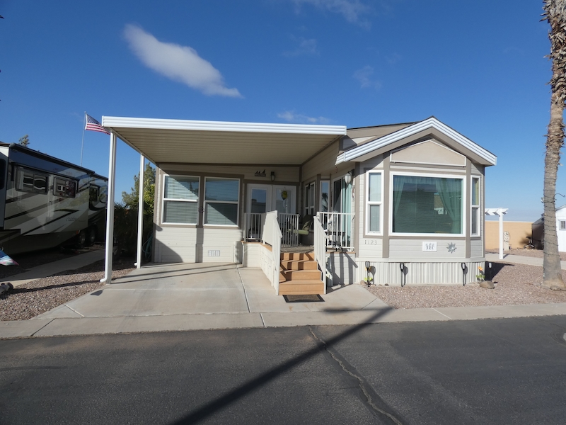 Ideally located in the pet-friendly section of the park at 1123 Sandy Desert Drive, is located on the west wall of the park, giving the back area plenty of privacy! This park model 1 bed 2 bath home boasts two additional rooms; one can be used as an den or office, the other is an Arizona room. This home comes turn key ready, furnished and ready for you to move in. The deck is perfect for hosting a small group of friends or for watching the beautiful Arizona sunrises. Enjoy your private back patio, perfect for relaxing, barbequing or reading a book. Guess what? After you buy your home, you’re not just a homeowner – you can also be a landlord! That right! You can sublease it and make your home work for you! Contact the sales department today for a showing, and start enjoying the resort life!Features