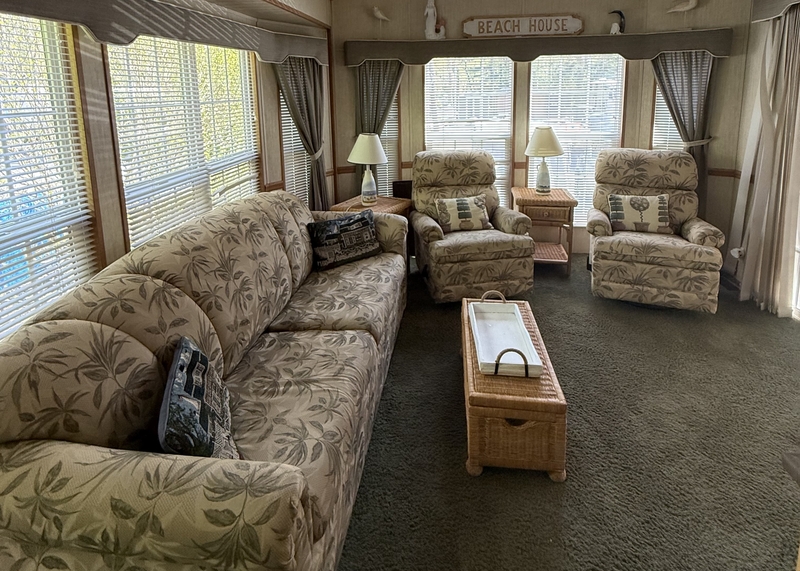 Enjoy effortless Cape Cod living in this fully furnished 1-bedroom park model home at the seasonal Sun Retreats Peters Pond RV Resort (April–October). This home offers a comfortable 3-season add-on room, a large lush yard perfect for outdoor gatherings, and a fire ring for cozy evenings. With parking for two large vehicles, a storage shed, and a peaceful location near the pool, recreation field, and Peters Pond beaches, this property is ready for you to start making memories right away.Features