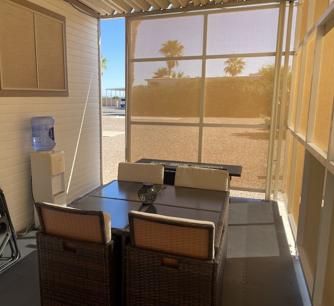 Discover comfort and convenience in this beautifully maintained 1 bedroom, 1 bath park model home located at 512 Desert Willow Drive in the non-pet section of Palm Creek Resort & Residences. Ideally situated in a prime location just a short walk to all of the amenities, this move in ready home offers the perfect blend of relaxation and resort-style living. Enjoy your mornings and evenings in the screened-in room, ideal for entertaining or simply soaking up peaceful surroundings. Inside, you will find an updated kitchen with new sink, refrigerator, and garbage disposal. The deck features new carpeting in 2024 and the roof was coated in 2023 giving you peace of mind and added value. Additional storage can be found in the two sheds, one is set up as a generous craft room with stackable washer/dryer and built in desk with cabinetry. This home is being sold furnished, so you can start enjoying the resort lifestyle from day one! Whether you are seeking a seasonal getaway or a year-round retreat, this property offers it all - a fantastic location, tasteful updates, and resort living at its best.Features