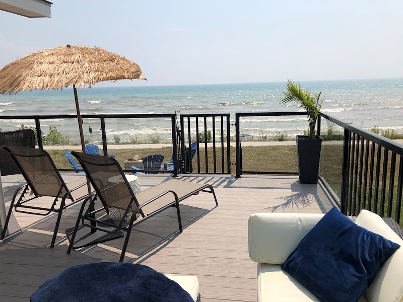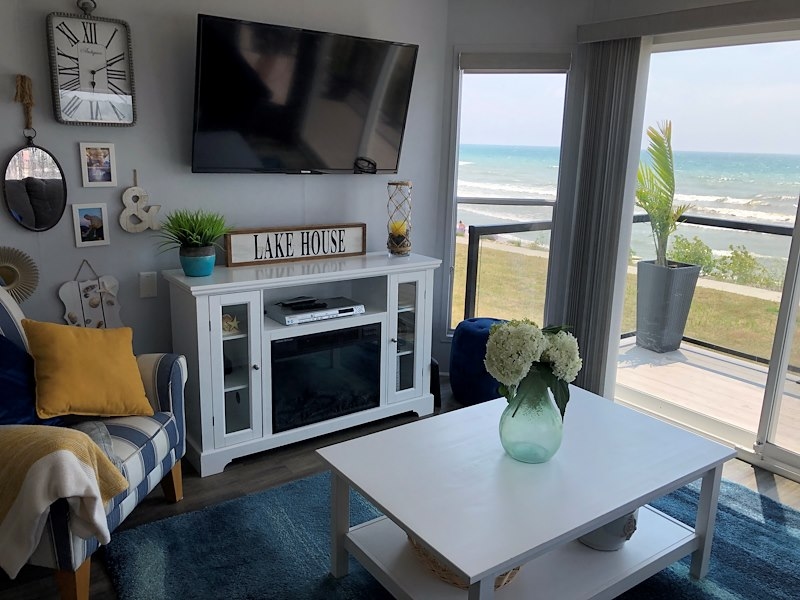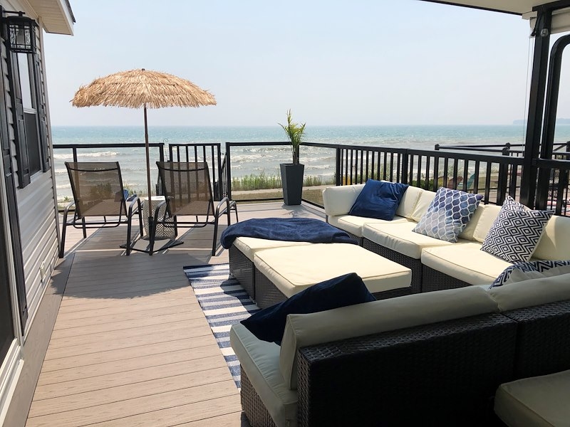 **BEACHFRONT AT WYLDEWOOD BEACH CLUB #117!** This updated beach house is move-in ready with 2 bedrooms, a bright and open living and kitchen area, and a fabulous wrap around deck so you can enjoy the beach all season! Enjoy the one of Lake Eries best sandy beaches right at the comfort of your deck, from sunrise to stunning sunset. Partially covered to make outdoor entertaining easy and comfortable for all. Comfortable inside with 2 bedrooms, an updated bathroom, and the added convenience of stackable washer and dryer in the laundry closet. This is resort living at its best! Contact the Sherkston sale team to book an appointment to view this stunning beach cottage!Features