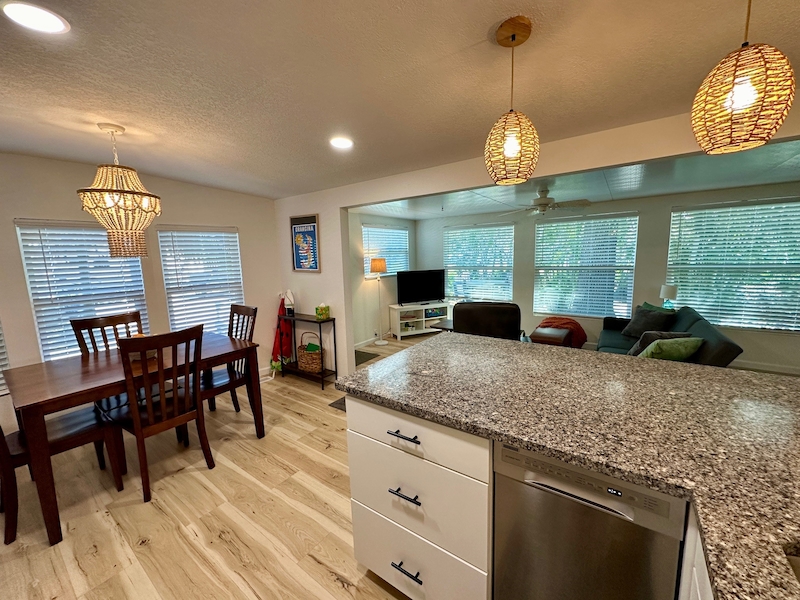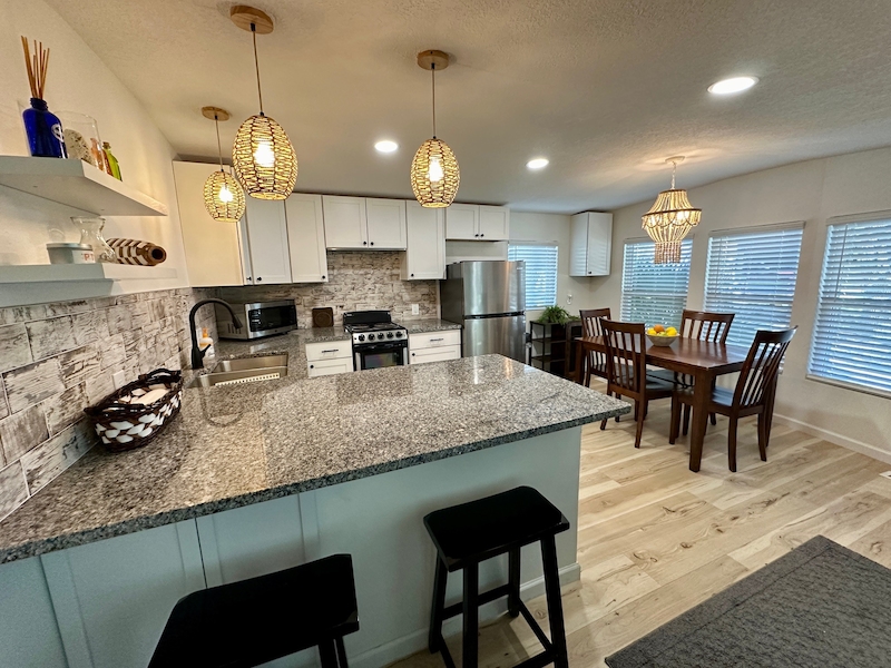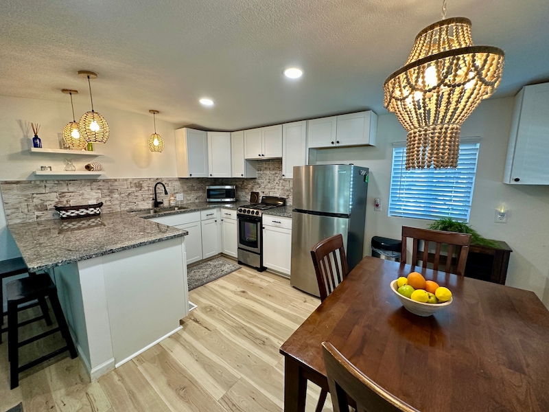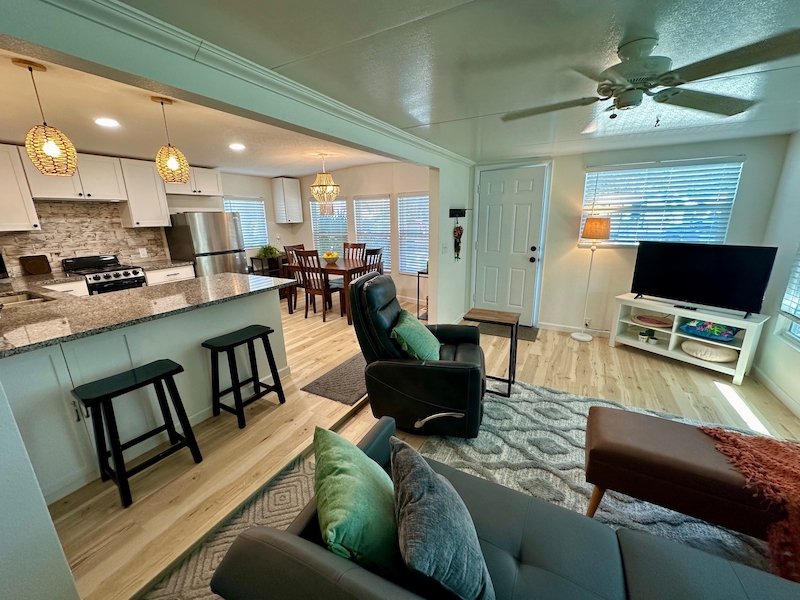 Indulge in the allure of this completely remodeled 2-bedroom, 2-bathroom doublewide haven. Noteworthy features comprise gleaming stainless steel appliances, including a dishwasher, and sophisticated granite counter-tops. Additionally, you'll relish the presence of two charming outdoor patios and the tasteful interior design. Conveniently situated in a central location, this home grants easy access to all amenities. the 814 sq ft boasts an expansive lot, stretching from end to end, and a tranquil side patio relaxation area. Secure your chance to experience this captivating opportunity before it's gone.Features
