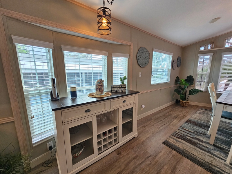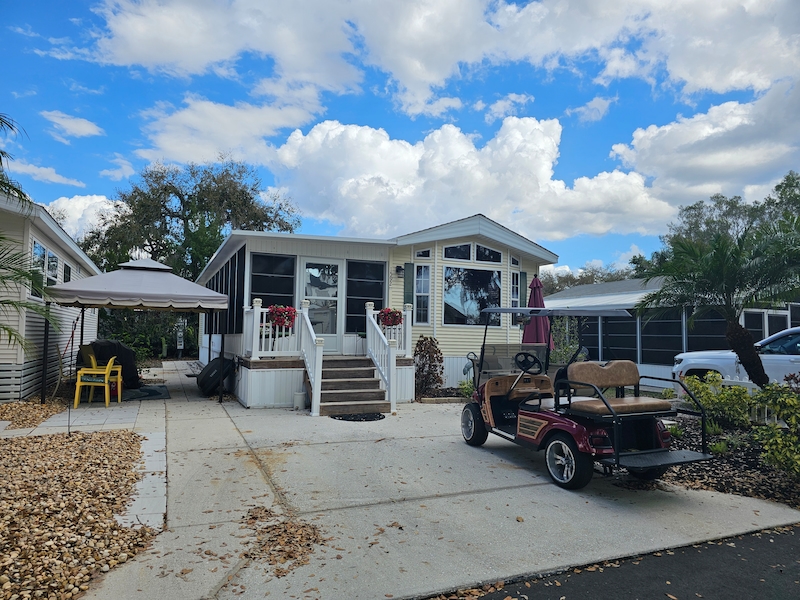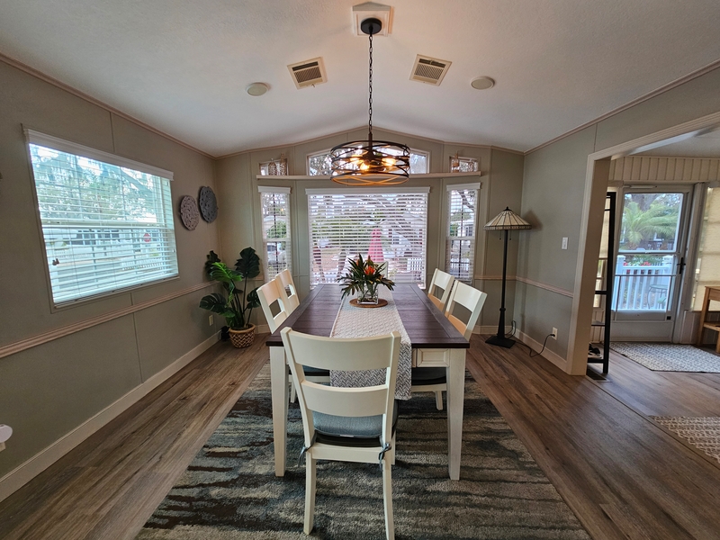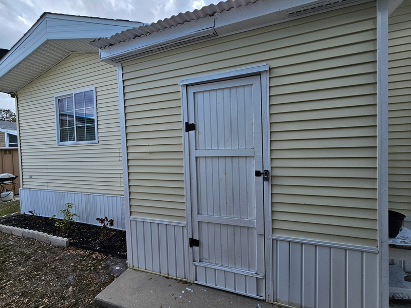 Welcome to this bright and inviting home featuring a wide, open floorplan designed for comfortable living and entertaining. Natural light pours in through a large picture window, creating a warm and airy atmosphere throughout the main living space. Enjoy Florida living with two spacious patios, both perfect for relaxing or hosting guests, and patio furniture is included so you can start enjoying the outdoor space right away. The home also features a converted lanai with A/C and stylish shiplap accents, providing a versatile bonus area ideal for a sunroom, office, or additional living space. Inside, you'll find a formal dining room perfect for gatherings and special occasions. The home has also been enhanced with an added second bedroom, offering flexibility for guests, family, or a workspace. GOLFT CART INCLUDED. Additional features include an extra storage shed, giving you plenty of room for tools, hobbies, or outdoor equipment. This home blends comfort, functionality, and charm—making it a wonderful place to enjoy everyday living.Features
