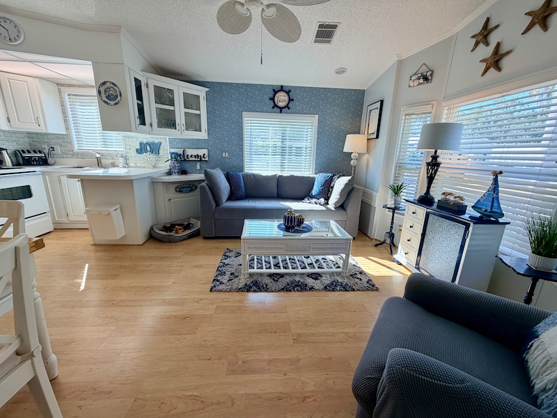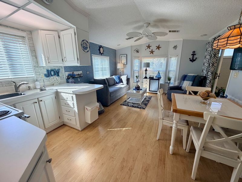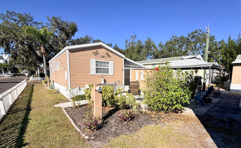 Charming and newly redesigned, this 1-bedroom, 1-bathroom home offers comfort, convenience, and modern style. Inside, you’ll find updated décor, *new windows*, a *new A/C unit*, AC to the lanai, a water softener, dishwasher, walk-in shower, and an in-unit washer and dryer for effortless living. The home also includes a spacious storage shed and a large patio—perfect for relaxing, entertaining, or enjoying the outdoors. This is the perfect low-maintenance getaway, and is a move-in-ready home that has everything you need.**Features