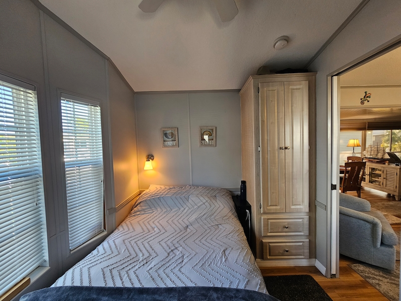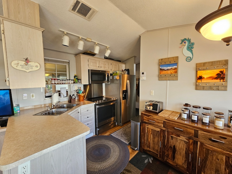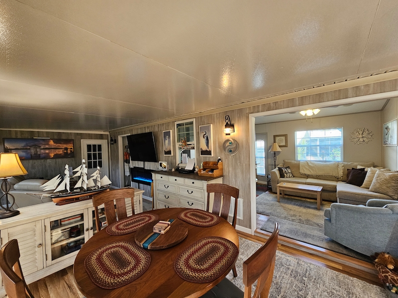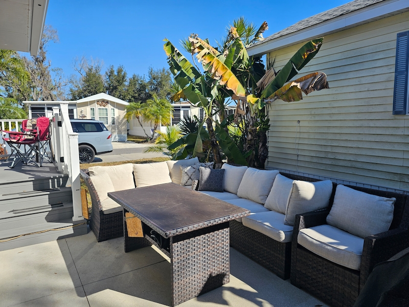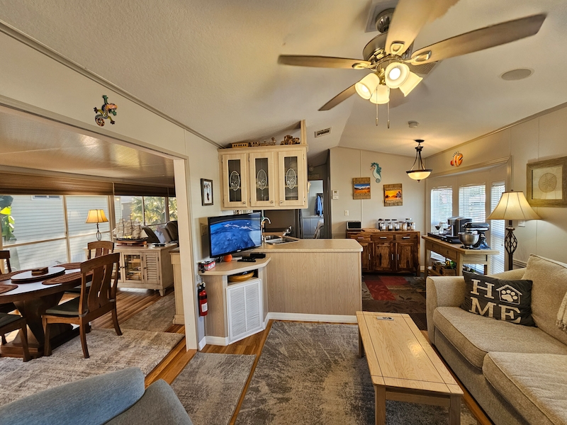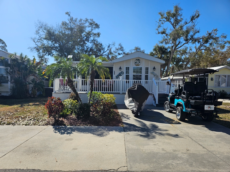 Welcome to your centrally located retreat! This charming 2-bedroom, 1.5-bath home is designed for relaxed living and easy entertaining. Enjoy mornings and evenings on the spacious front deck or patio, complete with comfortable patio furniture. Inside, the home features stainless steel appliances, converted shower and an open layout that flows seamlessly into the lanai, where an open wall and cozy fireplace create the perfect indoor-outdoor living experience. A dedicated golf cart shed adds extra convenience, making it easy to explore the area. Whether you’re hosting friends or unwinding after a day out, this home offers comfort, style, and an unbeatable location.Features